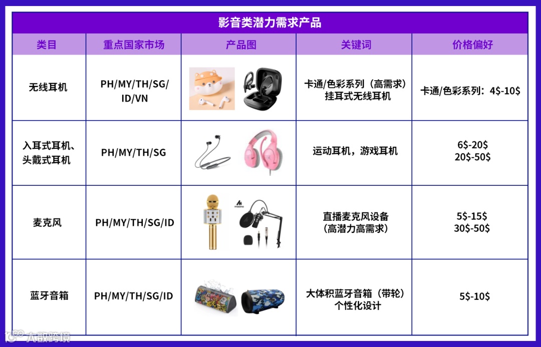 直播与短视频风潮席卷全球,人人皆可成为主播,东南亚也不例外。菲律宾、马来、泰国等各站点的年轻消费者在这全民直播时代,纷纷购置直播设备,加入直播大军,麦克风成为影音类高潜力、高需求产品。而一向喜爱室内卡拉OK的东南亚消费者,除了会购买麦克风自己在家k歌外,还会一并购置外观设计个性化的大体积蓝牙音箱,让自己沉浸在音乐的世界中无法自拔,蓝牙音箱也因此成为东南亚高增长高潜力的子类目。