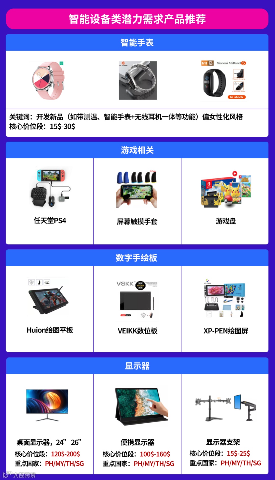 随着智能时代的到来,智能佩带产品逐渐成为年轻人的必备产品之一,智能手表也从最初简约高端的黑色手表向更多功能、材质与外观拓展。而电子游戏则成为当代年轻人主要消遣娱乐的渠道之一,与游戏相关的产品自然少不了被年轻人关注,注重游戏体验的玩家纷纷购置任天堂PS4与其搭配的游戏手柄和游戏盘。而不论是端游、手游都需要使用游戏原画,游戏原画师也成为来高薪紧缺人才,因此绘图数位板和高清显示器随着设计学习者的增多,需求量也不断增加。