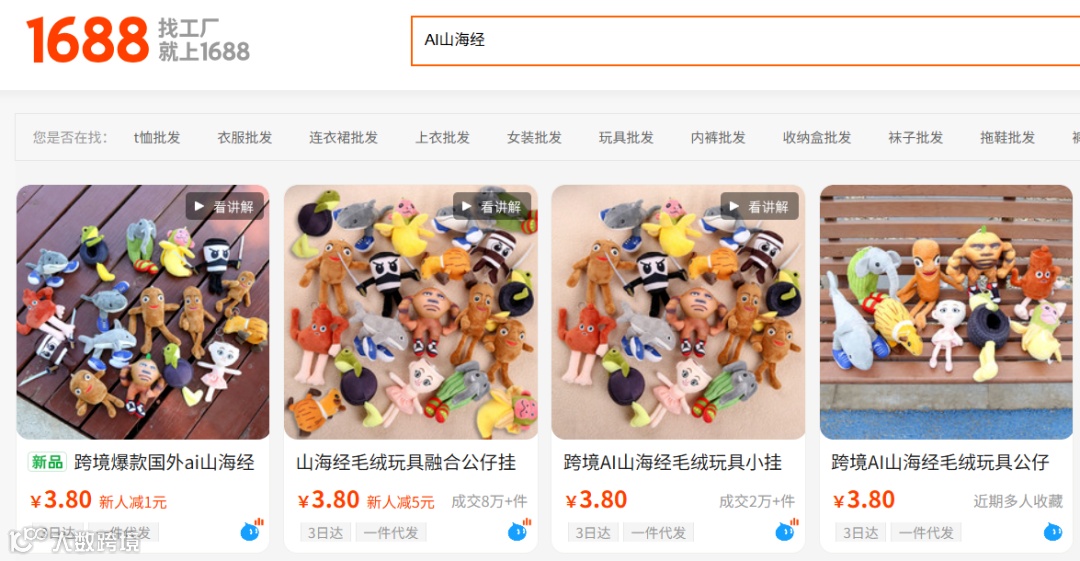 在海外,一种名为“AI山海经”的野生IP在半年内席卷全球社交平台。这些由网友用AI合成的怪诞形象,通过魔性视频传播,迅速衍生出毛绒玩具、手办等数十种商品。中国供应链快速响应,相关产品在亚马逊、TikTok Shop等平台热销,总销售额破百万,利润率高达25-30%。
