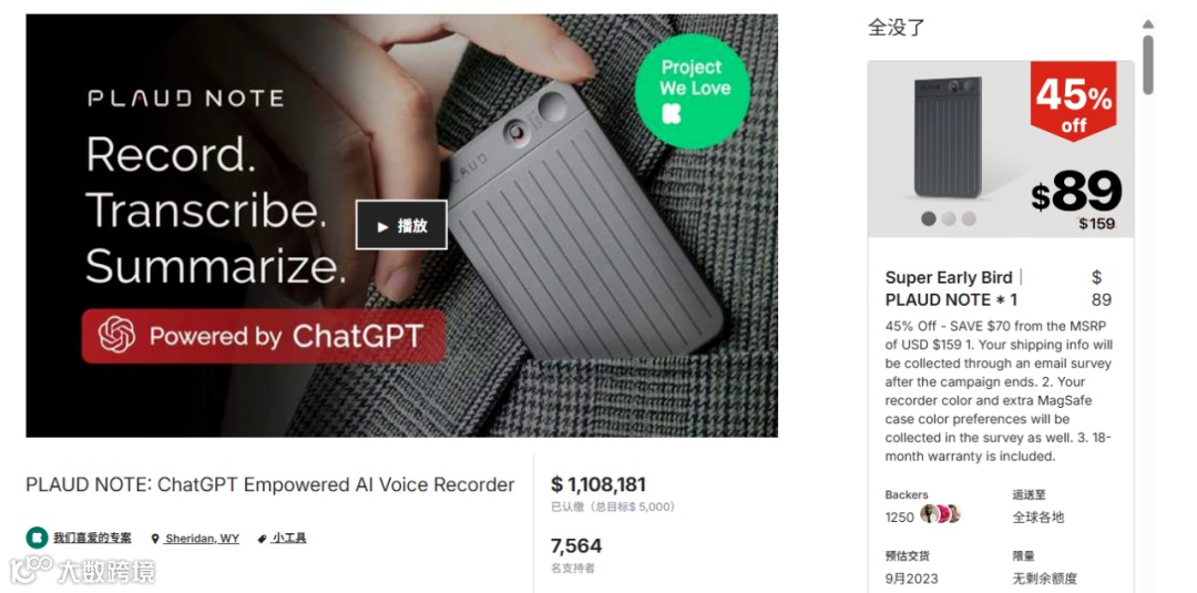 2023年6月,Plaud Note在Kickstarter首月吸引7564位支持者,众筹110万美元;后在Indiegogo筹得239万美元。2024年7月,它以159美元在亚马逊月销超5000台,月营收近80万美元。