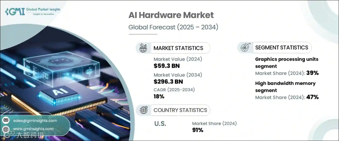 2024年全球人工智能硬件市场规模估计为593亿美元。预计该市场将从2025年的668亿美元增长到2034年的2963亿美元,复合年增长率为18%。