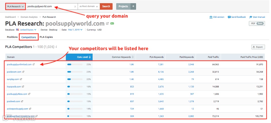 PLA竞争对手报告也可以帮助您找到谷歌广告的竞争对手。PLA(Product Listings Ads)表示产品列表广告。此报告将向您显示在Google购物搜索结果中,您的主要竞争对手有哪些。只需在PLA Research选项卡输入域名之后点击Competitors即可。