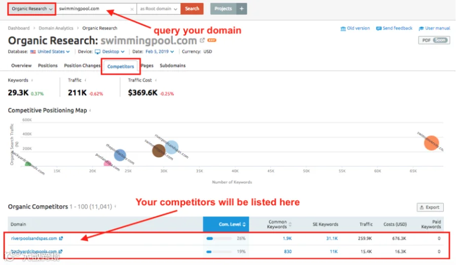 SEMrush提供以下6个报告来帮助您找到竞争对手:1.自然搜索竞争对手报告(基于共同的自然搜索关键词排名)