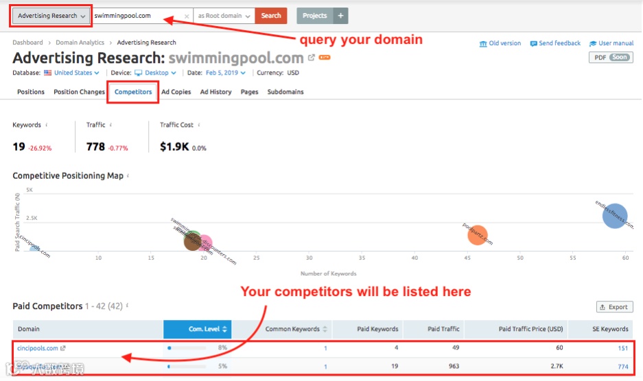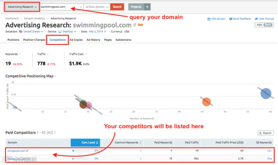 只需在Advertising Research下输入您的域名,然后点击Competitors Tab就可以获取竞争对手报告了。