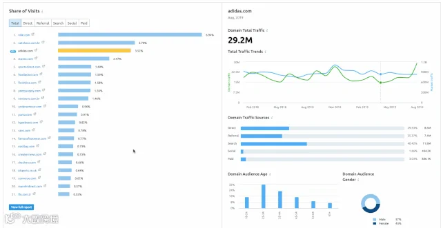 首先在搜索栏中输入您的域名。待页面加载完之后,下拉至Market Relevant Sites部分,您将看到查询域名所在的行业中一些主要的竞争对手网站。当你点击竞争对手的域名时,您会看到右侧显示了该网站的预估流量是多少。此外,您还可以查看网站的整体流量,流量趋势,流量的主要来源以及目标群体的年龄和性别等等。