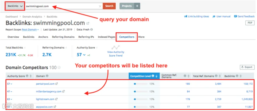 使用“外链竞争对手报告”也可以找到和您的网站有相同外链域名的网站。如果您想通过外链建设来提升SEO的效果,那么您可以通过以下方法找到竞争对手和它们的外链。