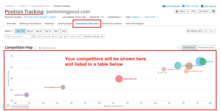 如果您的关键词还没有排名,但您有目标关键词列表,那么您可以通过Position Tracking工具来找到这些关键词对应的主要竞争对手有哪些。