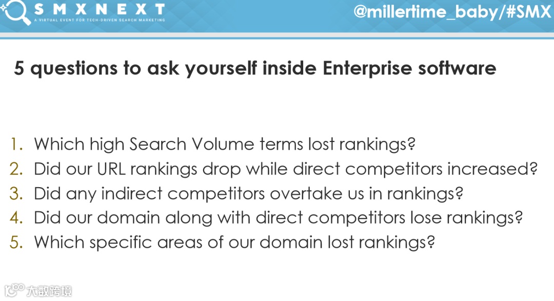 通过Enterprise Software, 可以重点分析以下5个问题,发现网站在搜索引擎的能见度变化,哪些关键词排名下降,哪些页面流量下降等关键信息。