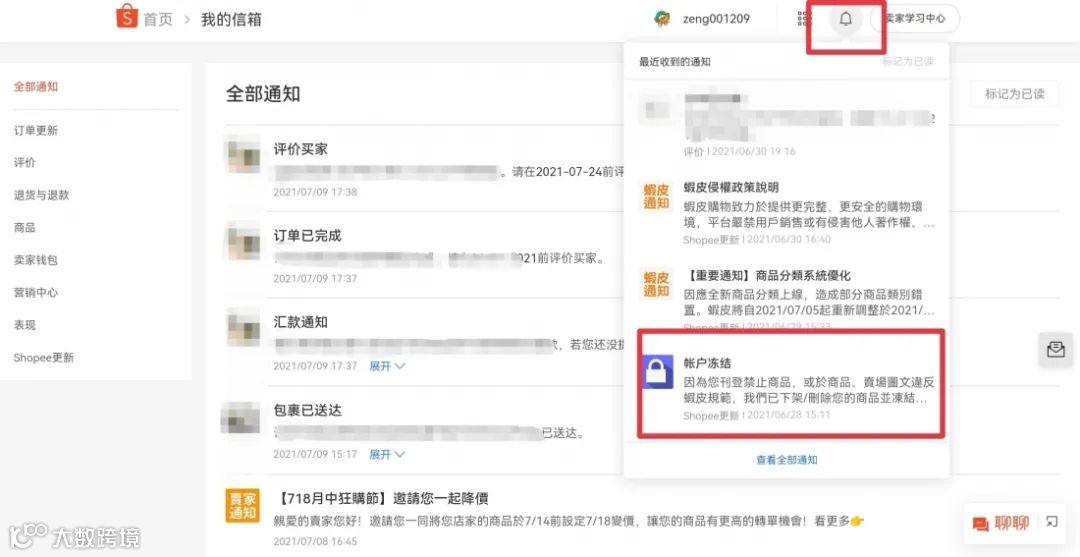2.系统通知。检查Shopee后台是否有紧急消息,例如商品被禁卖、客户一星差评、店铺违规扣分甚至被冻结等等,做出对应措施解决。