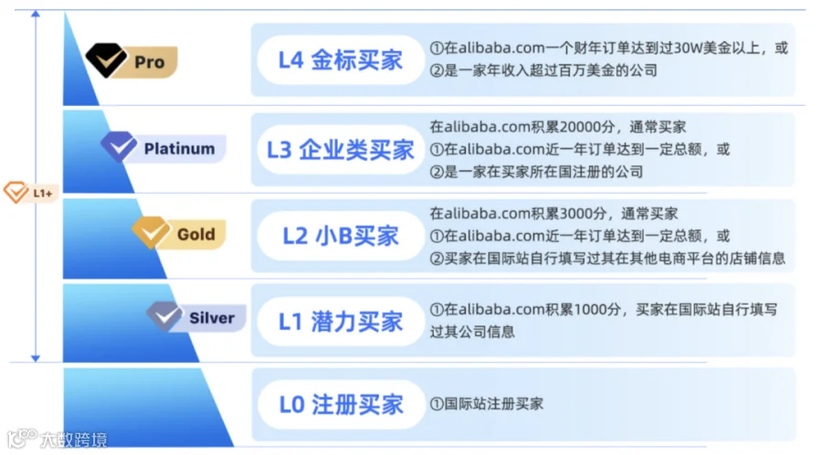 - L1:潜力买家,在alibaba.com积累1000分,并填写过公司信息