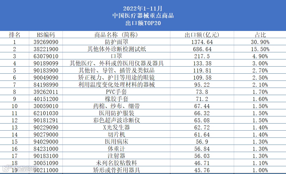据中国海关总署数据统计,2022年1~11月我国医疗器械出口总额达4441.79亿元,预计全年出口额为4785亿元。其中,非机械驱动残疾人用车出口额45.4亿元,占中国医疗器械重点商品出口额TOP20的1%,未来仍有较大发展潜力。