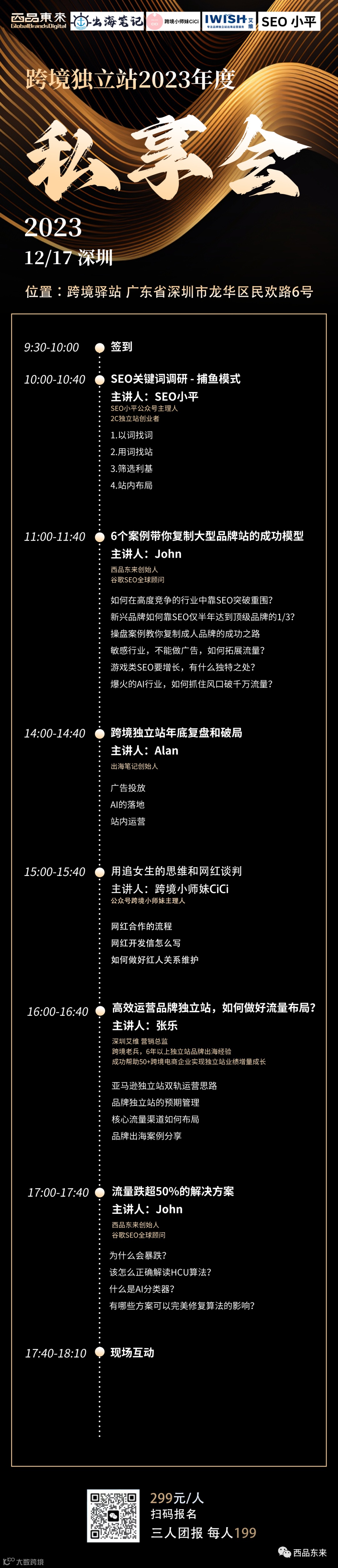 深圳场邀请了四位大咖嘉宾IWISH(艾维)张乐,出海笔记 Alan,SEO小平,跨境小师妹CiCi, 一起和大家探讨独立站的运营经验,为明年做好布局。