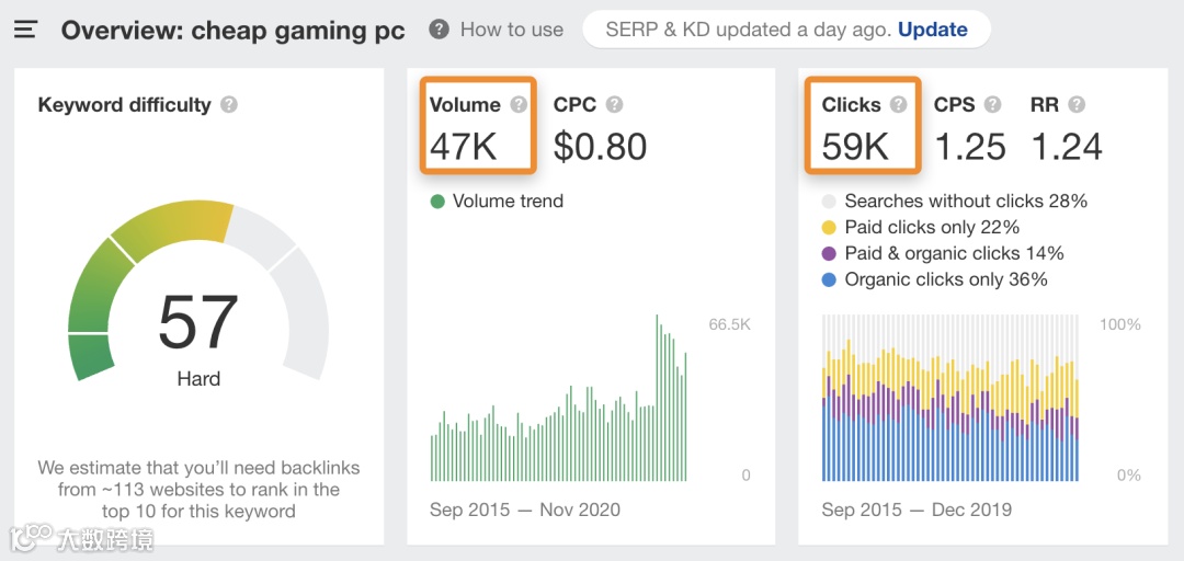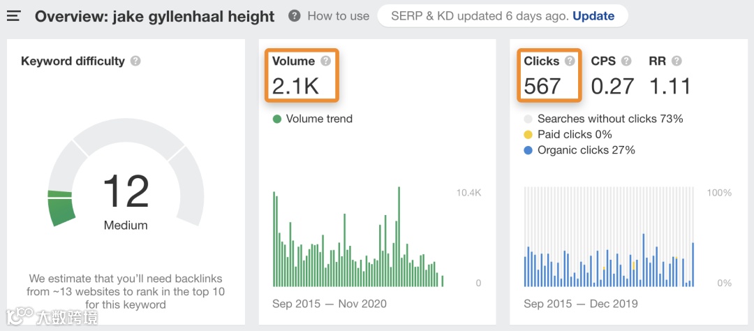 例如,Ahrefs是唯一显示搜索量和点击数据的工具。