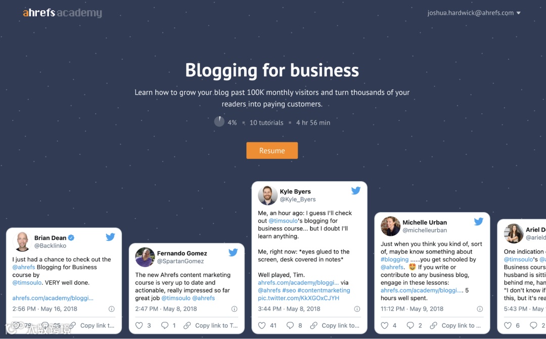 第三,他们的课程,比如商业博客和Ahrefs营销,帮助客户从Ahrefs的工作中获得更好的结果。