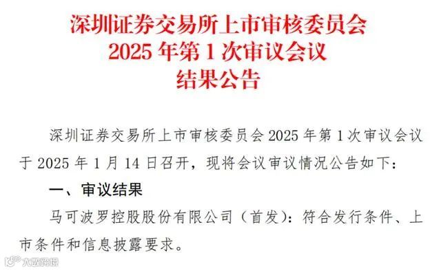 当日晚间,深交所发布2025年第1次审议会议结果,审议结果显示,马可波罗符合发行条件、上市条件和信息披露要求。