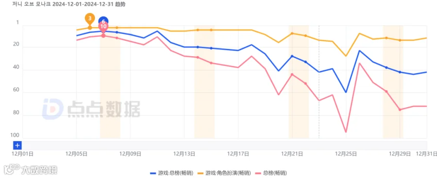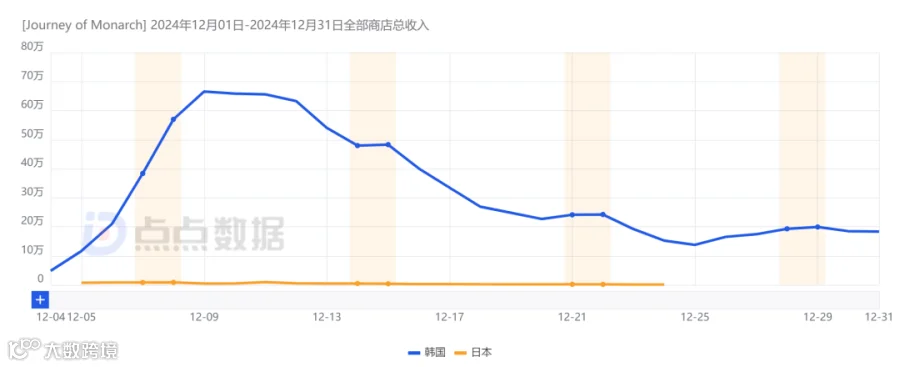 12月3日,由韩国网游大厂NCSOFT发行的魔幻题材放置玩法MMO《저니 오브 모나크》(君主之旅)正式在包括日韩两地在内的共167个国家及地区。点点数据显示,游戏上线当日便空降日本与韩国App Store免费榜总榜前十,且截止到十二月底,该游戏在所属分类免费榜的排名也维持在50名之内。与此同时,该游戏更是于本土正式公测当天空降畅销榜总榜第14,并于一周内排名稳定于前二十之内。