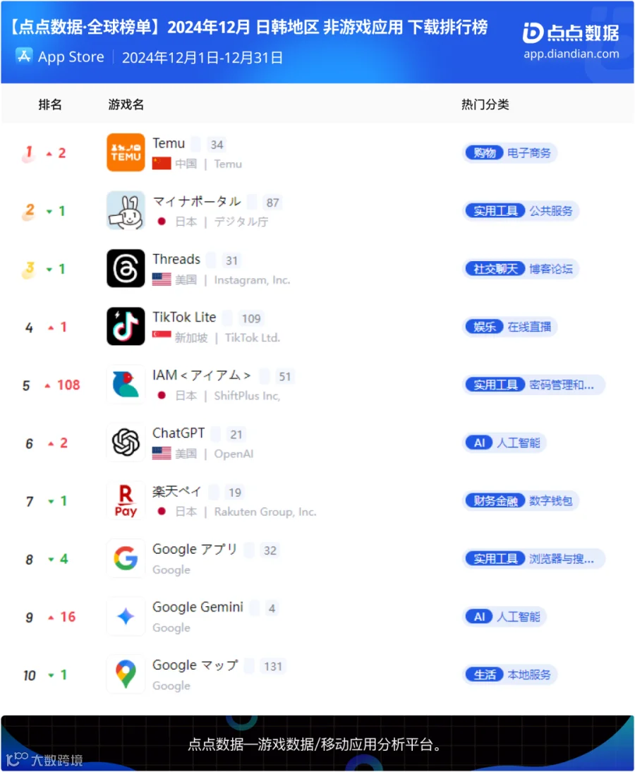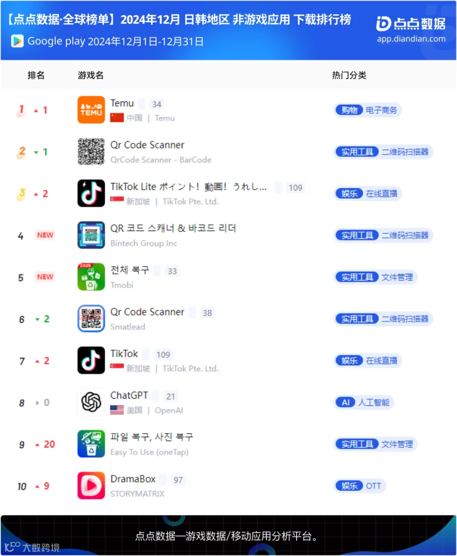 拼多多海外版本《Temu》十二月双平台下载总量超过184万再次蝉联日韩地区非游应用下载冠军;编码识别应用《QR 코드 스캐너 & 바코드 리더》以及手机清理工具《전체 복구》两款工具应用上月升入榜单前五。