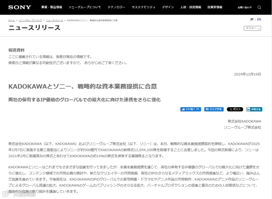 12月19日,索尼官方宣布,已经与角川签署战略资本和业务联盟协议,将于2025年1月7日以第三方配股的形式,索尼以500亿日元收购角川1205新股,在此之后索尼将成为角川的最大股东,占股约10%。
