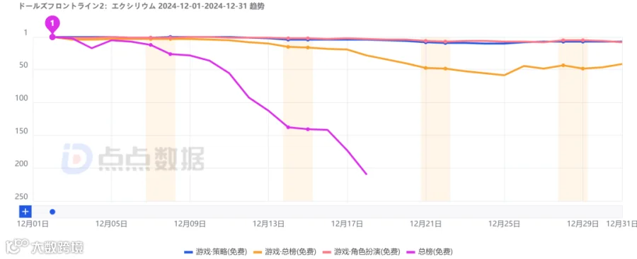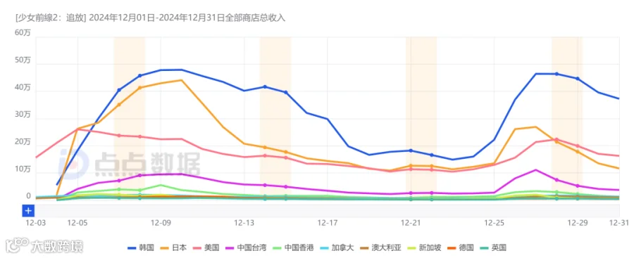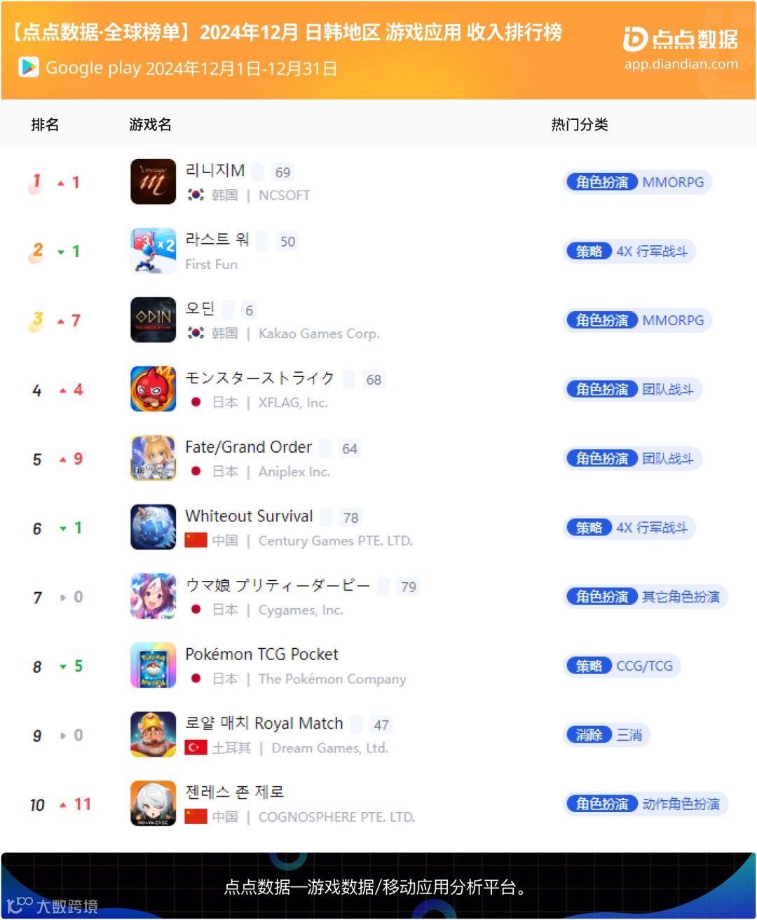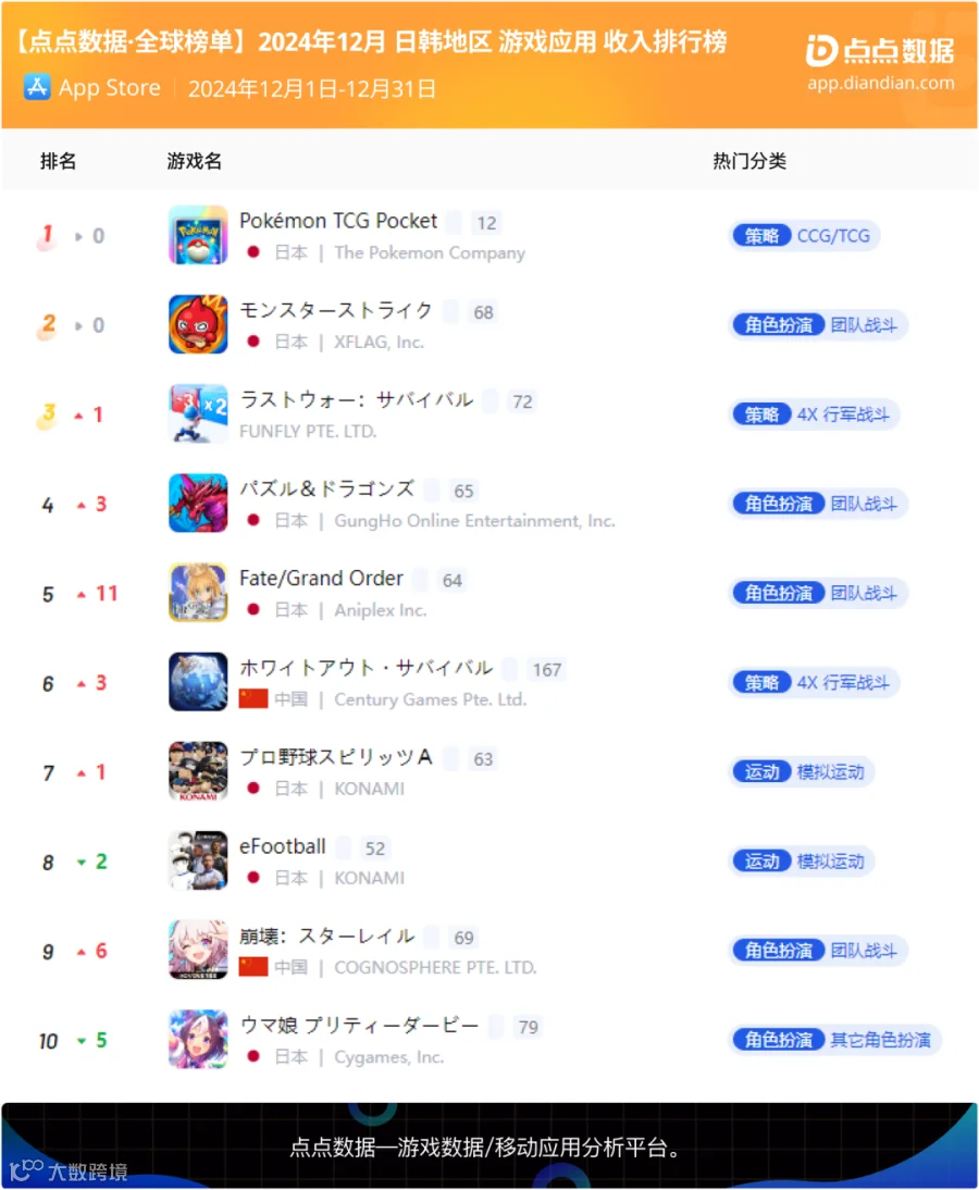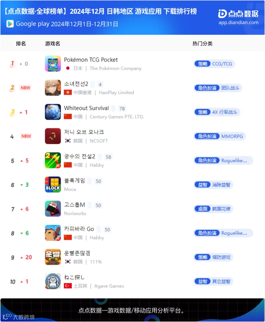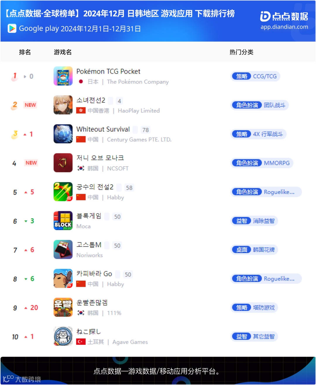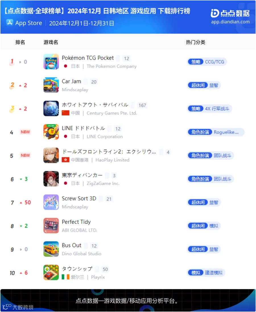 宝可梦集换式卡牌手游《Pokémon TCG Pocket》双平台总下载量超204万无悬念蝉联十二月日韩地区手游下载冠军;由好玩互动负责日韩地区发行的散爆旗下知名二游系列产品《少女前线2:追放》上线首月双平台上榜前五,LINE旗下肉鸽手游《LINE ドドドバトル》以及NCSOFT旗下天堂IP放置MMO《저니 오브 모나크》同样于上线首月上榜。