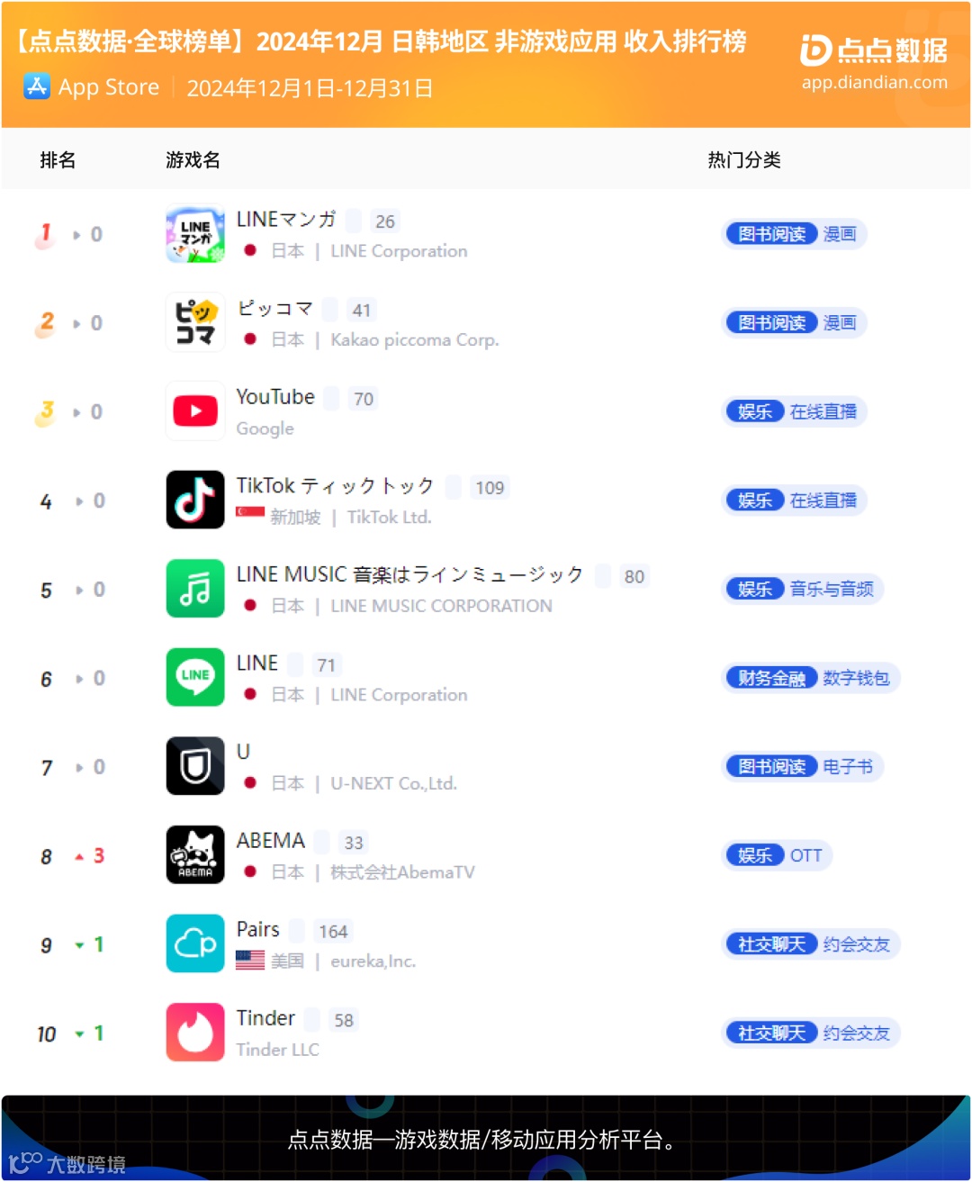 Kakao旗下漫画应用《ピッコマ》凭借在Google Play平台的数据优势再次力压《LINEマンガ》蝉联十二月日韩地区非游应用收入冠军,其上月预估收入超过3210万美元;本土流媒体应用《ABEMA》上月预估收入上浮明显重返榜单前十。