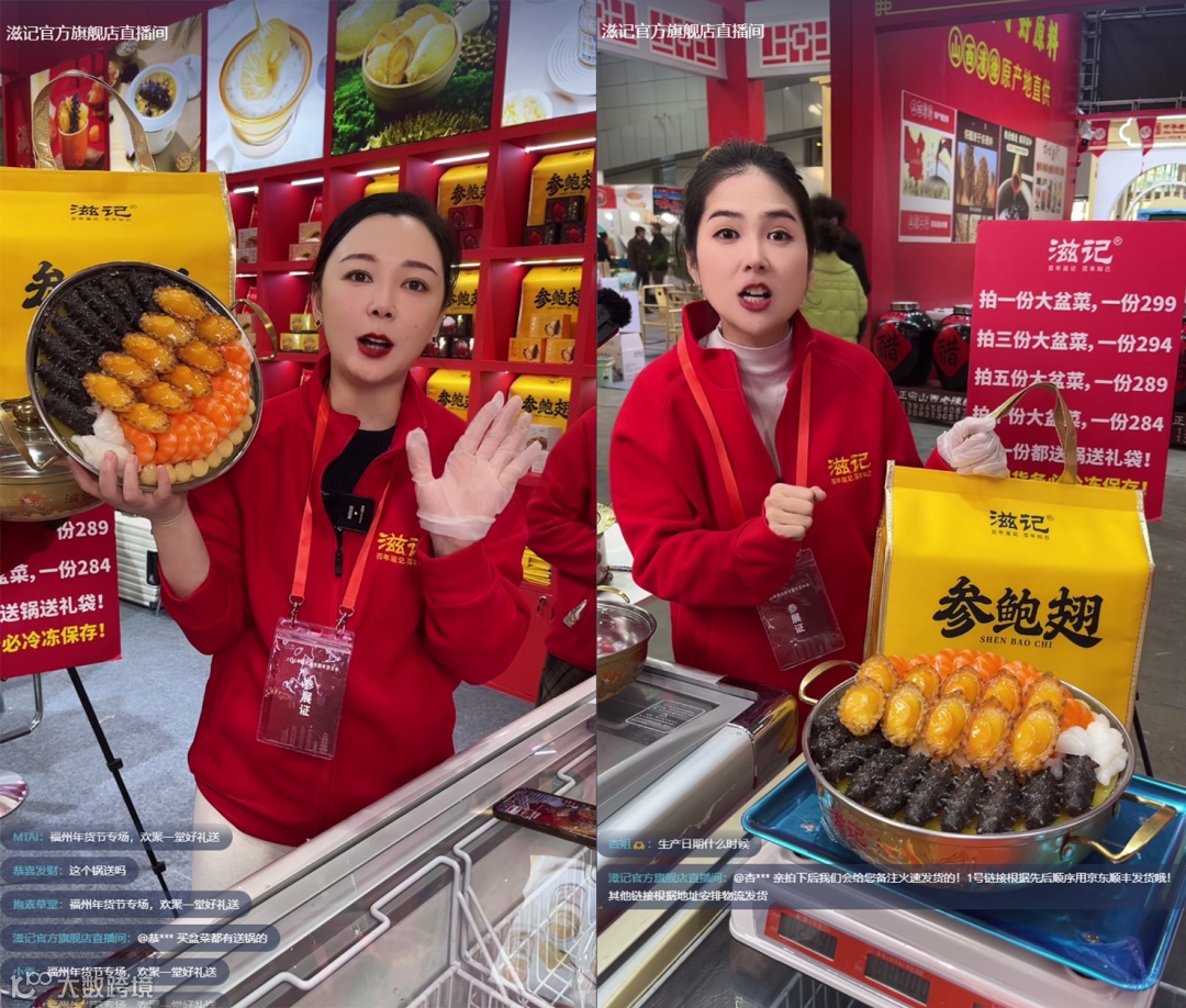 滋记官方旗舰店则把直播间搬进了“年货展会”现场。1月10日,品牌参与福州都市圈年货大会,直接在现场架起了机器。