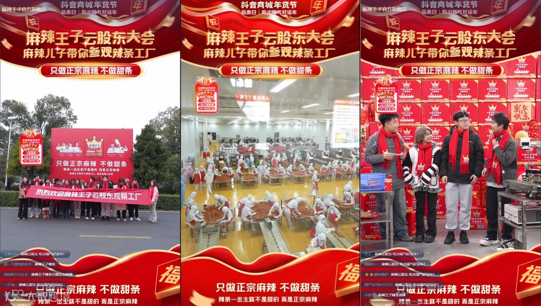 另一个直播间,麻辣王子,走的是“总裁开播”剧本,但又加上了一点小巧思。1月7日,麻辣王子旗下真正的“王子”,aka 麻辣儿子,组织了一场“云股东大会”,带领粉丝参观自家工厂。