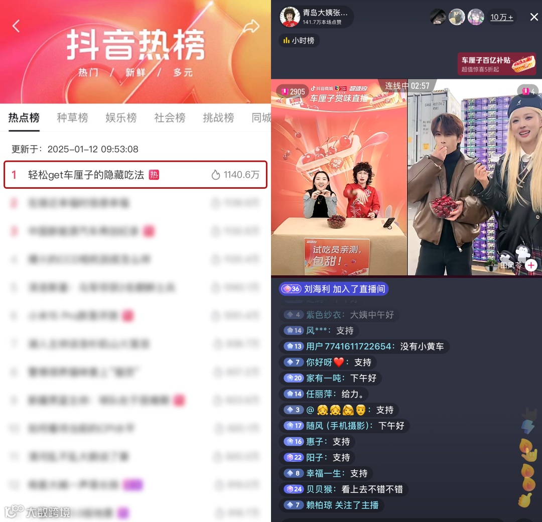直播间热度创下了达人历史直播数据最高,在互动和发酵中,各品牌车厘子又收获了一波流量。