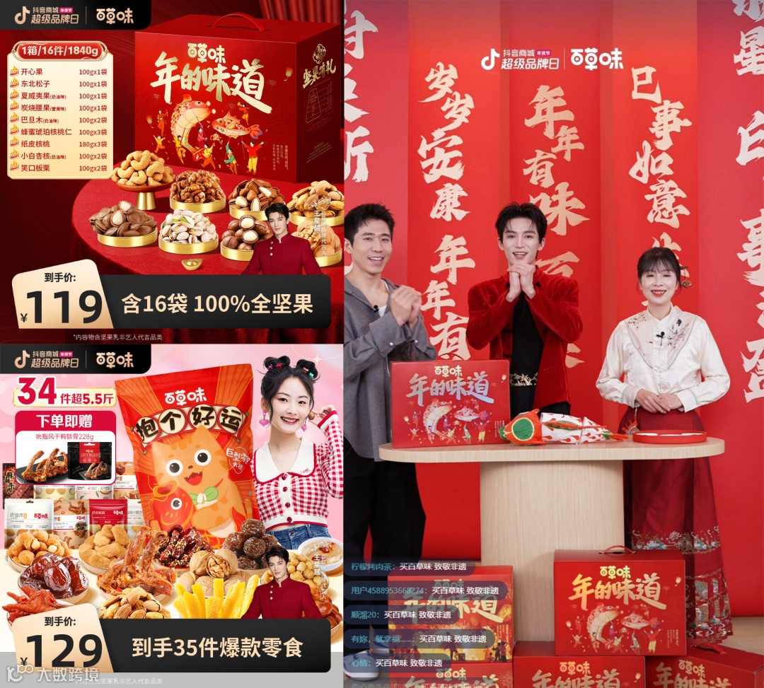 在百草味的直播间里,品牌请来了代言人王星越和非遗鱼灯传承人潘敏,现场做起了非遗鱼灯,在春节申遗成功之后的第一个年货节,击中了大家对于传统文化的自豪感,也顺势带出年俗礼盒这一特色货品。最终,这场直播的 GMV爆发45倍,场观爆发20倍+。