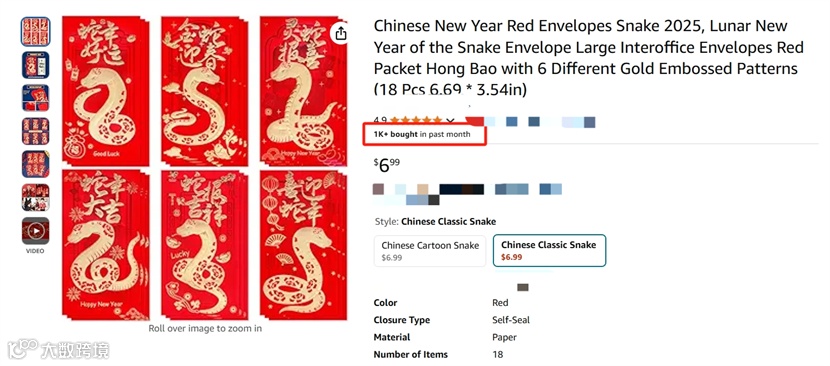 在以美国消费者为主的某电商平台上,各式各样的春节装饰品和节日用品已上架,其中蛇年红包袋、对联、窗花装饰、巧克力金币等多种产品在近一个月均有多条商品链接销量超过1000件。