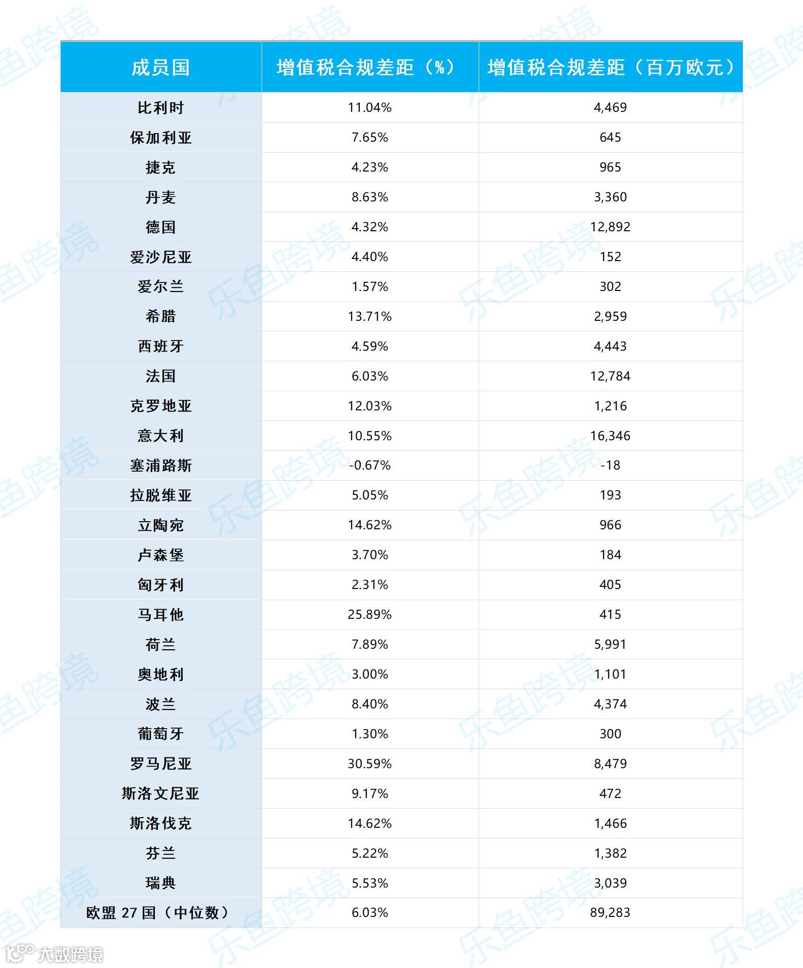 表中以百分比(%)表示的合规差距,说明该国家理论应收增值税收入中流失的比例。例如,罗马尼亚的合规差距为30.59%,表示大约30%的增值税未被收取。