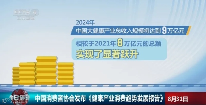 根据中国消费者协会发布的《健康产业消费趋势发展报告》显示,2024年中国大健康产业总收入规模预计将达到9万亿元,2030年有望达到29.1万亿元。