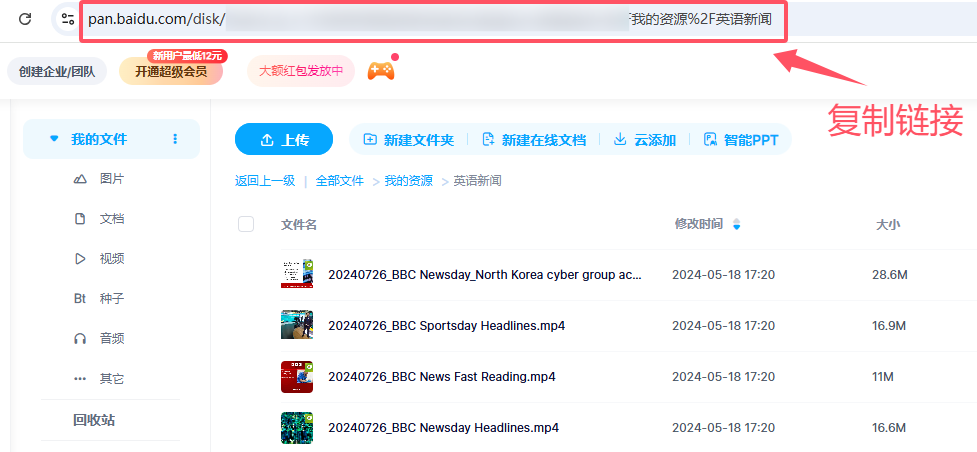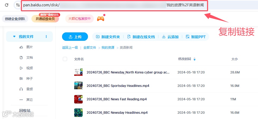 以百度网盘为例:在浏览器打开百度网盘,复制文件夹路径链接。大家记住:浏览器一定要安装私信获客宝插件,插件和网盘页面要一直保持在线状态,才能实现文件自动同步到「私信获客宝」内。