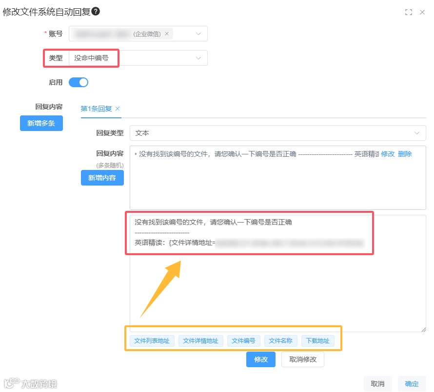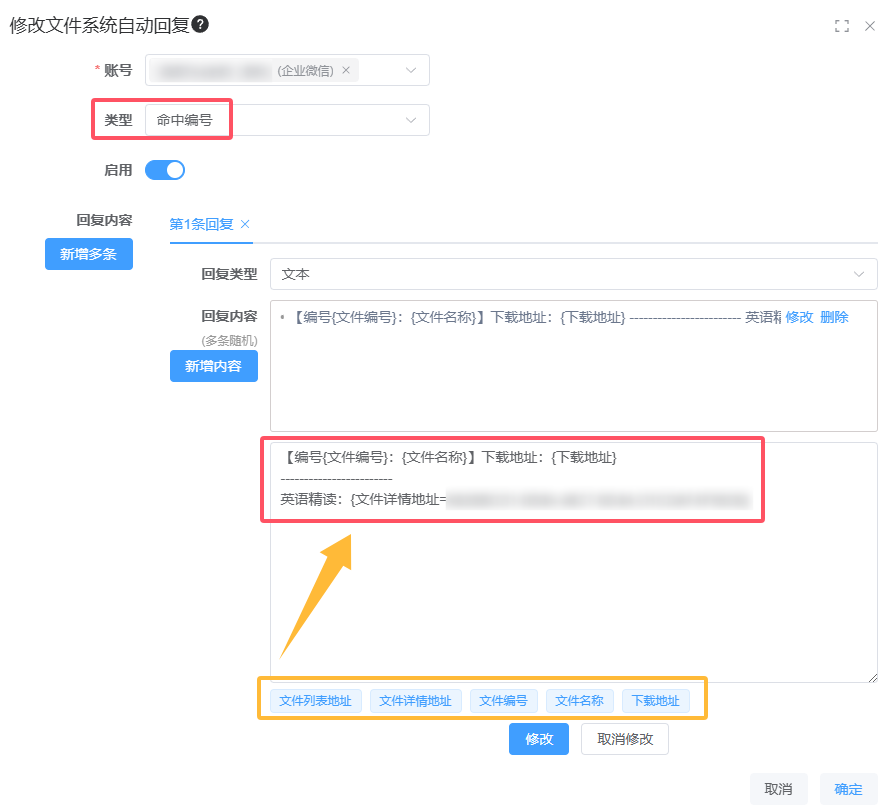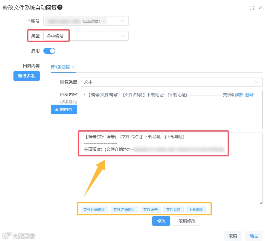 在设置“命中编号”的页面上,直接添加黄色框内的快捷方式,大家可以根据自己的需求编辑发送格式。当粉丝发送编号时,「私信获客宝」就会自动匹配【文件管理】内的文件,并将对应编号的文件地址链接回复给粉丝。
