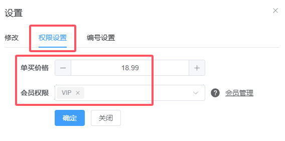 价格设置好后,最后在文件或文件夹“权限设置”页面可设置购买单份文件的价格,及会员权限。