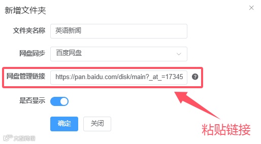 第二步,在「私信获客宝」的【文件管理】功能里,输入文件夹名称及选择百度网盘,粘贴第一步复制到的百度网盘文件夹路径链接,点击确定后,【文件管理】后台就会自动获取网盘文件夹内的文件,并自动给每个文件生成网盘分享链接及编号。