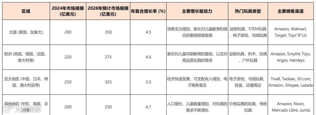由表可见,北美儿童玩具市场在全球占据明显主导地位。全球儿童玩具市场持续扩张,作为市场基石的战略地位愈发显著。