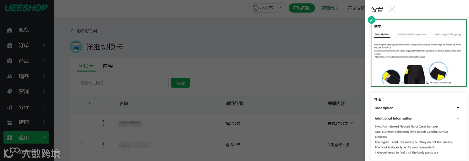Ueeshop详细切换卡功能,可以为产品添加多个产品描述,更全面地展示产品不同方面的信息,帮助卖家呈现更多样化的内容,进而提高消费者购物体验和购买欲望。