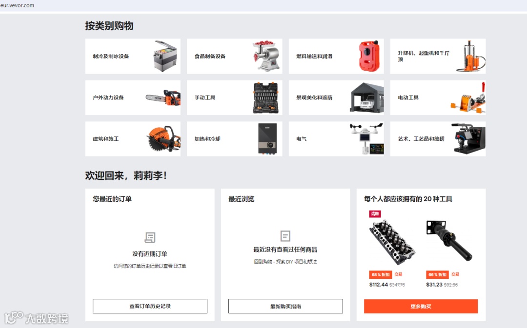 从独立站设置来看,常规品牌的独立站基本以大篇幅画面展现品牌内核和产品卖点,而Vevor则以产品分类为主,下方展出近期购物订单。甚至没有太多精美的海报,各类指引和设计都更偏向亚马逊等电商平台风格,高度适配该品牌极其丰富的产品线。