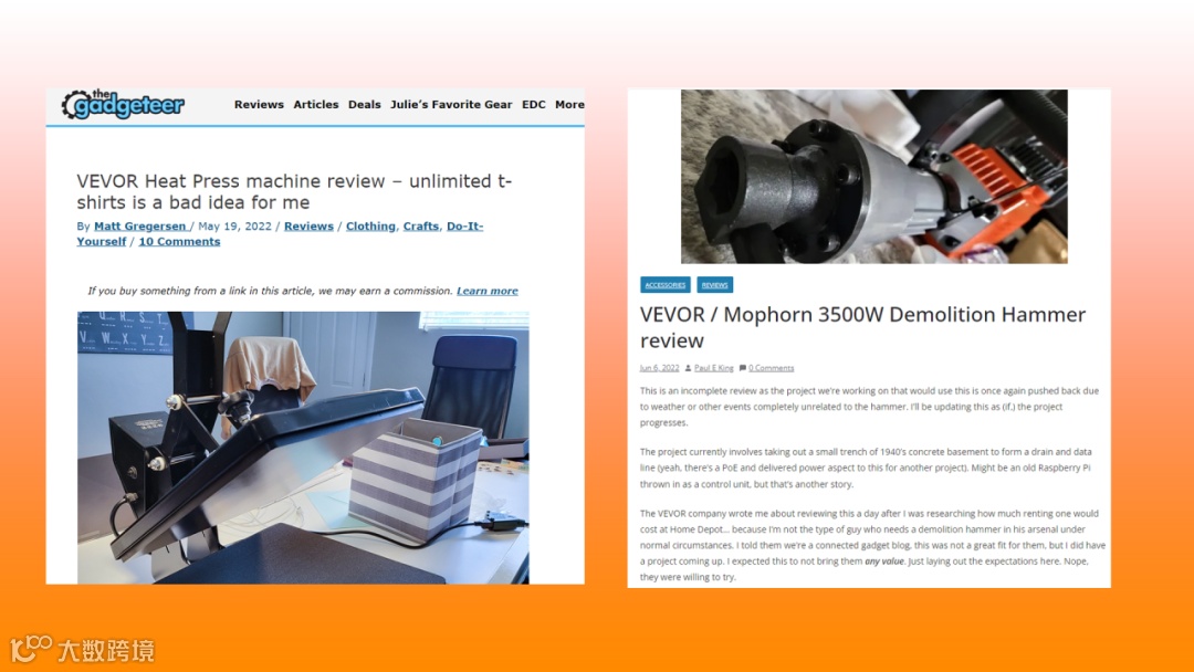 例如早在2022年Vevor向知名垂直博客The Gadgeteer寄送热压机,经过试用后改网站就上线了该产品的深度测评长文。以第三方使用者视角直观地输出真实体验,为潜在消费者提供了可信度更高的内容。