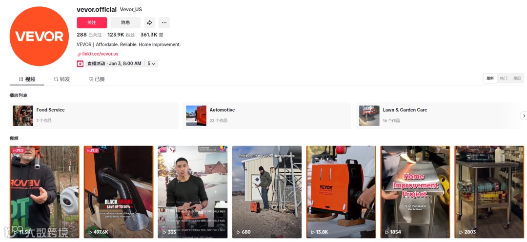 作为出海品牌,Vevor同样注重利用社媒平台营销推广,主要集中在facebook、instagram、tiktok以及YouTube。但Vevor的“不走精致风”,一直延续到了社媒平台中。