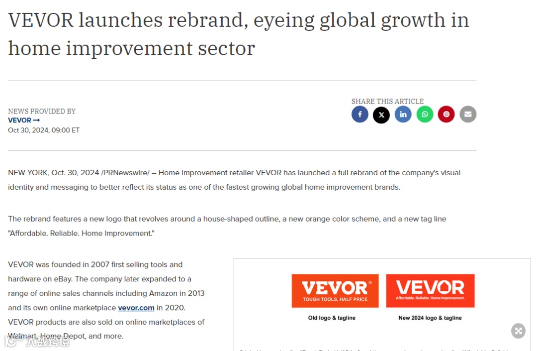 不久前Vevor对公司视觉标识进行重塑,以更好地反映品牌文化。10月底通过外媒稿件发布品牌logo变化资讯,并公布新的品牌slogan。作为品牌文化和品牌形象的重要组成部分,通常logo变化难以引起广泛传播。但通过媒体手段告知品牌动态是必不可少的,侧面也有利于加强形象建构。