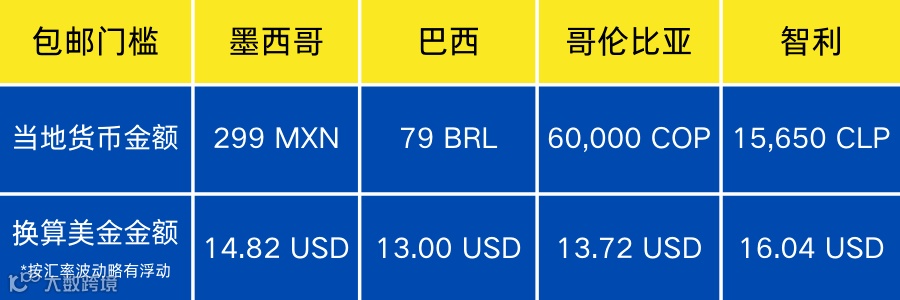 以巴西的包邮门槛为例,如果商品售价低于13美元,运费将由买家承担;售价高于13美元,运费则由卖家承担。
