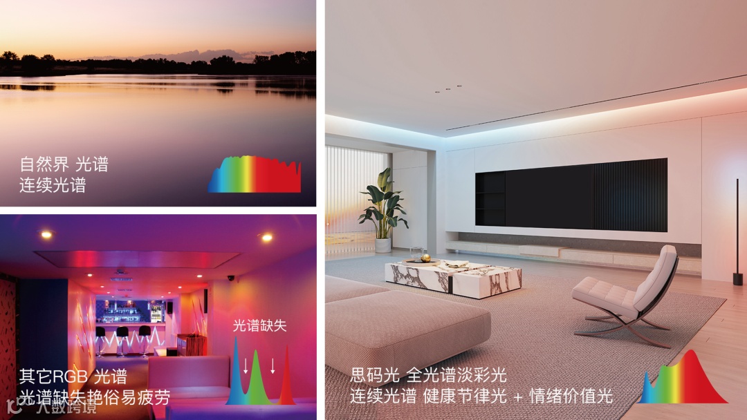 功能与美学,日常与情绪,对思码光来说,灯光的意义不是单向,而是互补的。比如动态淡彩光能够很好地弥补灯光在情感表达上的不足;而思客装饰艺术灯则能补充了无主灯环境下立面光源和点光源的缺失。