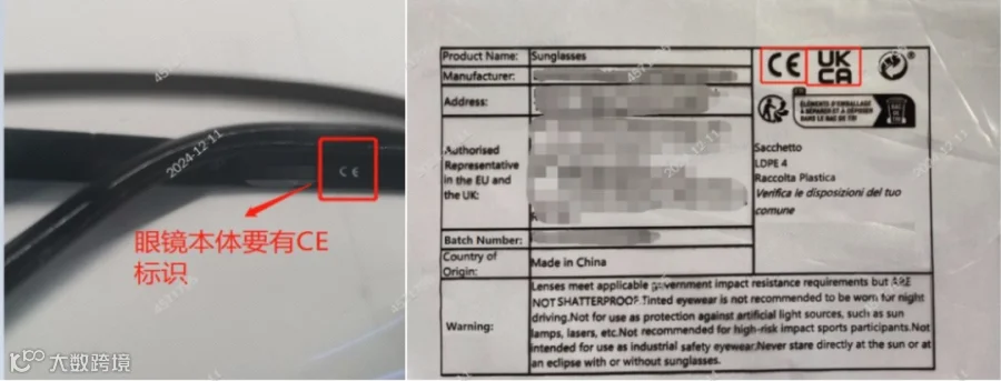 2、关于太阳眼镜产品的要求:若太阳眼镜产品上架欧洲市场,眼镜本体上必须要有 CE 标识,包装上要有 CE 及 UKCA 标识。