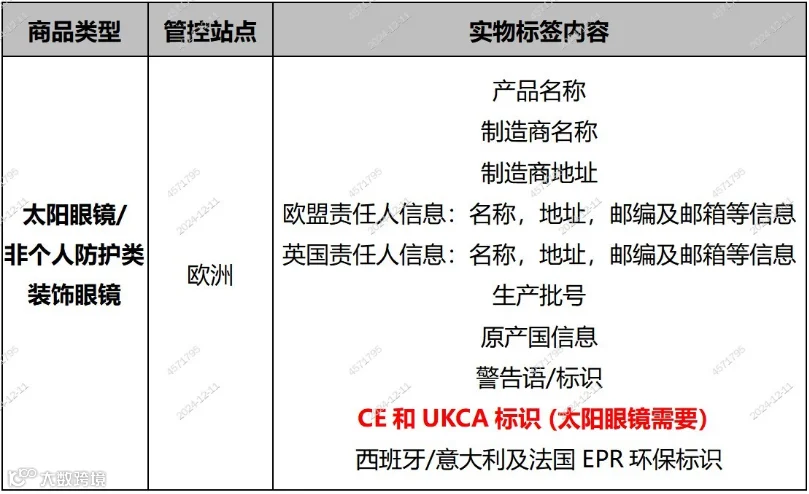 基于产品安全风险管控需求,平台将参考欧盟《通用产品安全法规》(General Product Safety Regulation)及英国《2005 年通用产品安全条例》要求,对太阳镜及非个人防护装饰眼镜标签实施以下规范要求,自2024 年 12月13 日起,新入库产品需满足新标签模板要求,否则将可能面临罚款下架以及退供等处罚。
