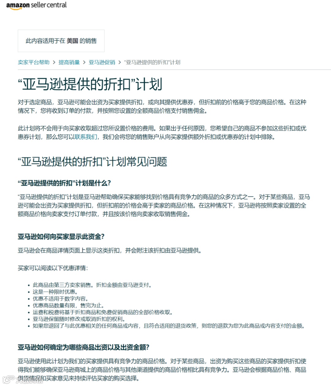 霞光社查阅亚马逊卖家中心网站获悉,“亚马逊提供的折扣”计划指出,对于某些商品,亚马逊可能会出资为买家提供折扣,亚马逊会在商品详情页面上显示这类折扣,折扣金额由亚马逊支付。