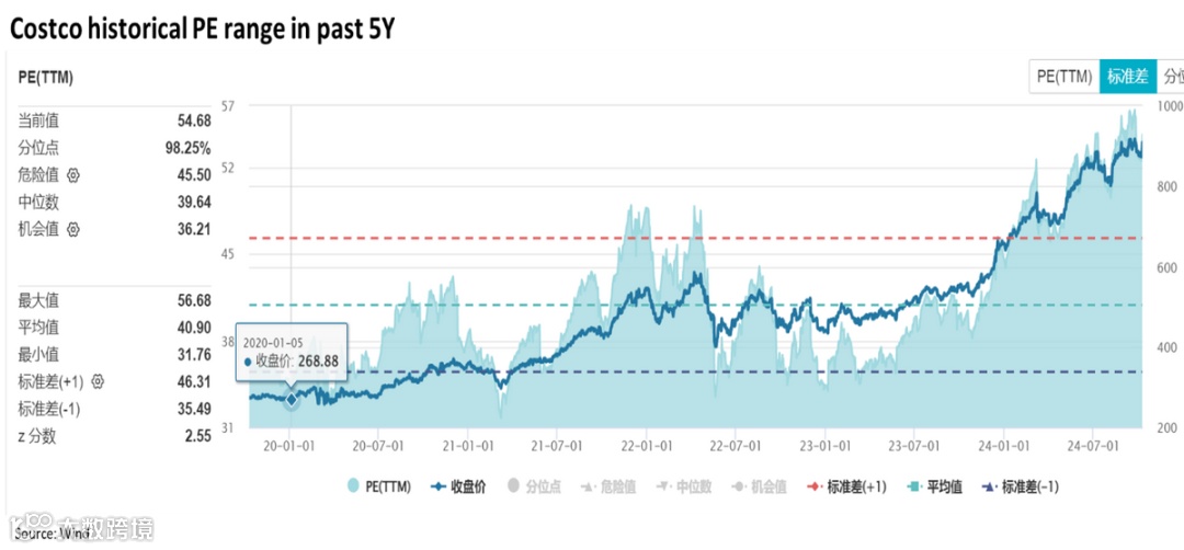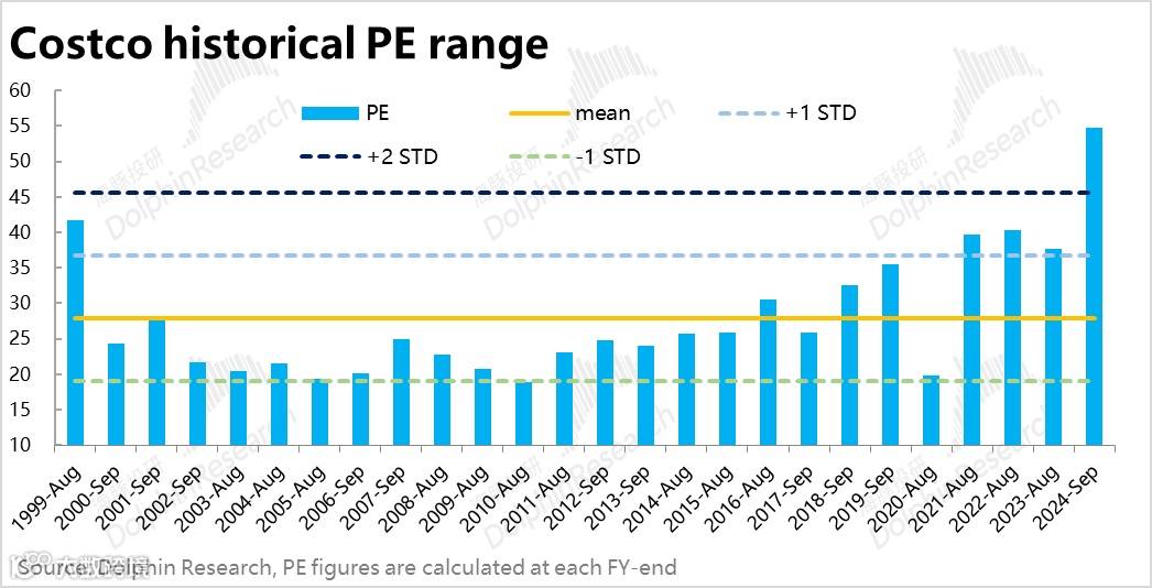 由下图可见,从1999年至2024年每财年末PE的均值为27.9x,而目前(24财年末)Costco的PE已高达近55x,已高于过去20多年PE均值2倍标准差以上。历史上,如此“高高在上”的PE倍数,Costco仅在2000时“dot.com bubble”的最高峰时有过一次先例。即便将回溯时间缩短到近5年的美股大牛市阶段,Costco目前的估值也依旧高出均值(40.9x)两倍标准差以上。