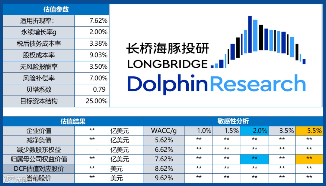 1)一般情况下,我们对永续增速是采用2%,大致相当于美国的稳态GDP增速。即大约在20多年的时间尺度内,Costco的利润/现金流增速会逐步下滑到2%。在此情况下,我们测算出Costco每股股价为$**,对应25年净利润相当于 **x PE。相比目前股价有巨大差距,但也符合历史上Costco的平均估值。隐藏内容请进入长桥App「动态-投研」板块,查看同名文章。