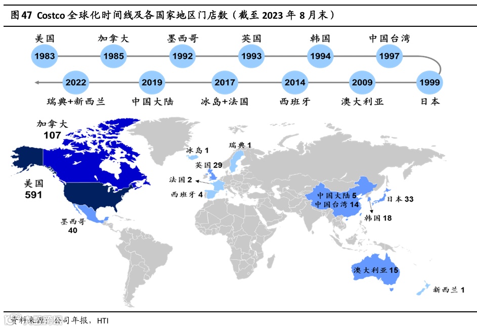海外拓展上,可以看到Costco早在上世纪80年代刚成立初期,就着手于海外市场的拓展,至今覆盖约14个国家,截至2024财年末,海外门店(除美国和加拿大)的门店总数168家,占总体的近19%,可以说已小有成果。且从上图可清晰看到,在美国&加拿大两个核心市场和同在北美的墨西哥,其他国家的门店总数最多不超过小几十家。