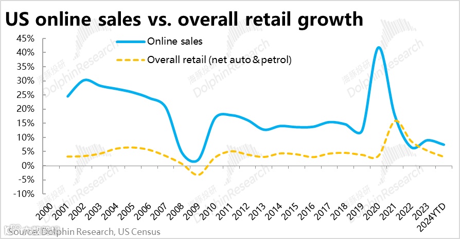 另一个清晰且验证可行的发展方向这是线上化。虽然近几年美国整体线上零售的增速开始向整体零售快速靠拢,但相比新千年以来平均已不超过5%的整体零售增速(剔除汽车和油气),线上零售近年来也至少有高个位数增速,仍有相对的高成长性。
